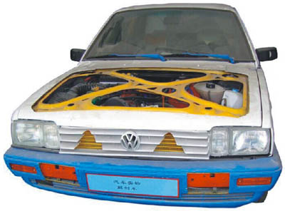 多功能解剖車選用桑塔納2000為基礎(chǔ),可容易地看見發(fā)動(dòng)機(jī)艙、車身側(cè)圍的構(gòu)造結(jié)構(gòu)、鋼板的厚度及獨(dú)立懸掛的結(jié)構(gòu),甚至車輪的輪轂及輪胎的橫截面。此外,車內(nèi)方向盤、排擋桿、手剎、安全帶固定裝置及安全帶卷等平時(shí)都被包裹嚴(yán)實(shí)的部件也被特別地一剖為二,內(nèi)部工藝精度、構(gòu)造清晰呈現(xiàn),能夠展示汽車各總成裝置以及各附件位置。