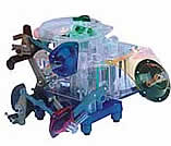 本品選用透明有機玻璃制作,內(nèi)中部件均以硬質(zhì)塑料料加工,用 螺絲固定在金屬高溫烘漆而成的車架上。各總成部分都以壓模成形加 工,代替過去膠粘合的方法,使產(chǎn)品在強度上有很大提高。發(fā)動機總成用電機驅(qū)動,在油門處設(shè)有調(diào)速裝置,能演示發(fā)動機轉(zhuǎn)速高低。離合器分離明顯,操縱靈活,離合器外殼整體壓模而成,變速箱和各檔齒輪用各種顏色表示,換檔靈活,手制動美觀。后橋外形壓模而成,內(nèi)中主減速、差速轉(zhuǎn)動自如,輪轂剎蹄壓模成型,剎蹄可調(diào)節(jié),前橋輪鼓可調(diào)整,轉(zhuǎn)向裝置以及電瓶、油箱、水箱,制動管路分布清楚一目了然。電路采用對插件前后分布,燈架、風(fēng)窗、儀表板、后燈架用透明有機玻璃壓模成整體美觀逼真。